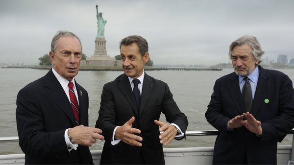 French President Nicolas Sarkozy (C) talks with New York Mayor Michael Bloomberg (L) and US actor Robert de Niro (R) as they travel to the celebration of the 125th anniversary of the Statue of Liberty on September 22, 2011 in New York.ERIC FEFERBERG/Bloomberg
