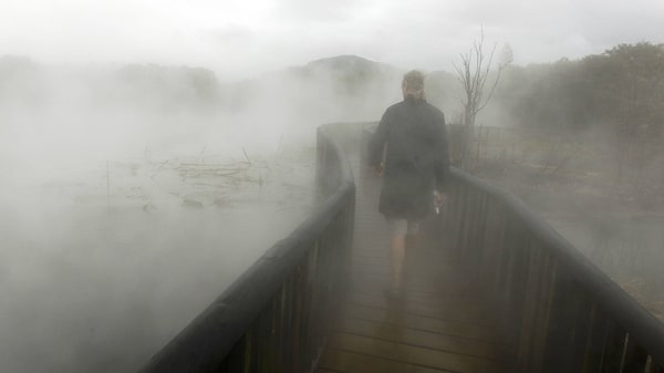A tourist walks through steam on a bridge above thermal water in a park in Rotorua September 25, 2011. The geothermal activity and bubbling mud volcanoes are the main attractions of the central area of the northern island of New Zealand.BOGDAN CRISTEL