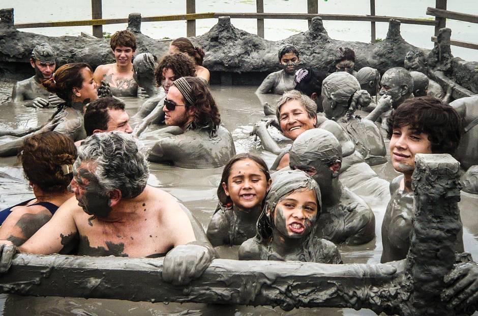 About an hour’s drive outside Cartagena lies a natural phenomenon known as Volcan de Lodo El Totumo, a volcano with thick, mineral-rich, chocolate-textured mud bubbling in its crater. Formed by various geological forces, mud volcanoes, free of hot lava but saturated with sedimentary sludge, are found around the world. Several volcanoes are featured in this book, and bucket listers should take great care not to fall into their craters. This particular volcano, on the other hand, wants us to jump right in.