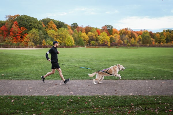 Properly fitted gear is key for both humans and dogs. A canicross harness promotes full range of motion and unencumbered breathing for a dog (even when pulling hard), while a hands-free leash belt reduces back strain for the human runner and helps maintain balance. The bungee line connecting the two absorbs shocks, reducing the likelihood of the runner being thrown off balance if the dog makes any sudden movements.