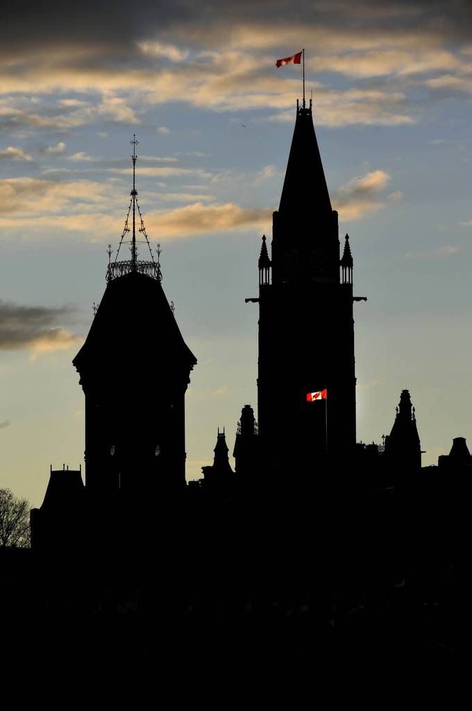 A Canadian flag flying outside Parliament Hill is backlit by the setting sun. Much of downtown Ottawa was shutdown after a gunmen shot and skilled a member of the Canadian Forces who was standing guard at the War Memorial.