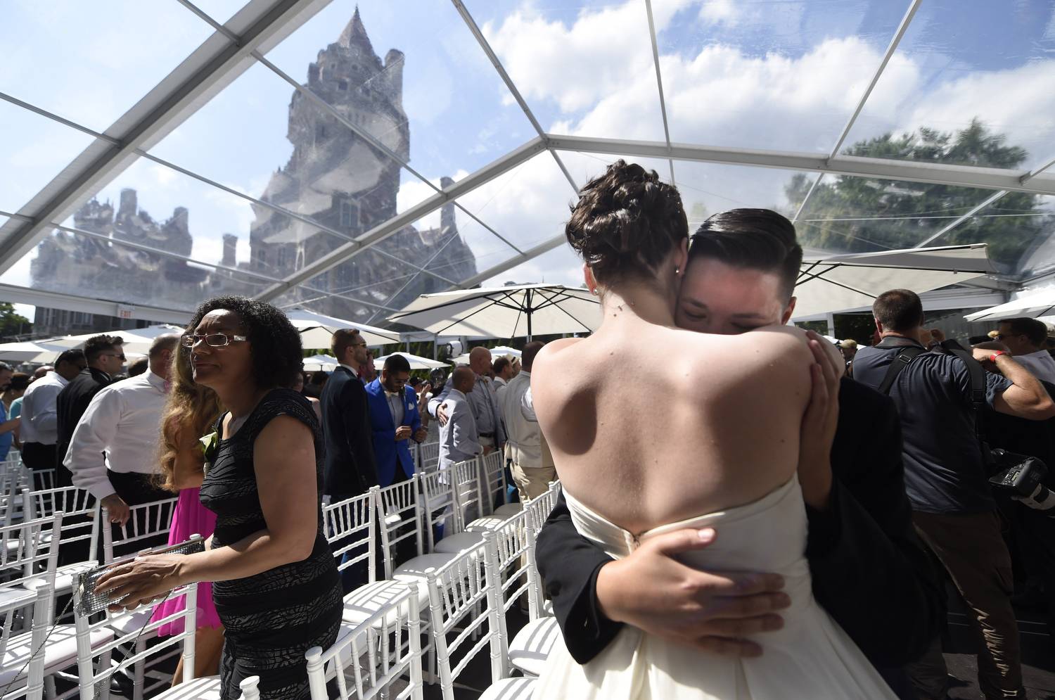Dayna Murphy (white dress) and her partner Shannon St. Germain dance after getting married during a mass LGBT wedding at Casa Loma.