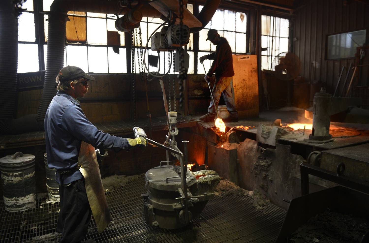 A worker refills the pouring ladle from the induction furnace at the Bowmanville Foundry Company.