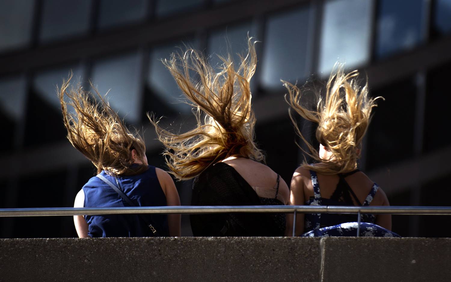 While trying to have their photo taken on the green roof at Toronto City Hall, Emma McIntosh, Breanna Phillips and Julia Ratz have their hair whipped around by gusty winds.