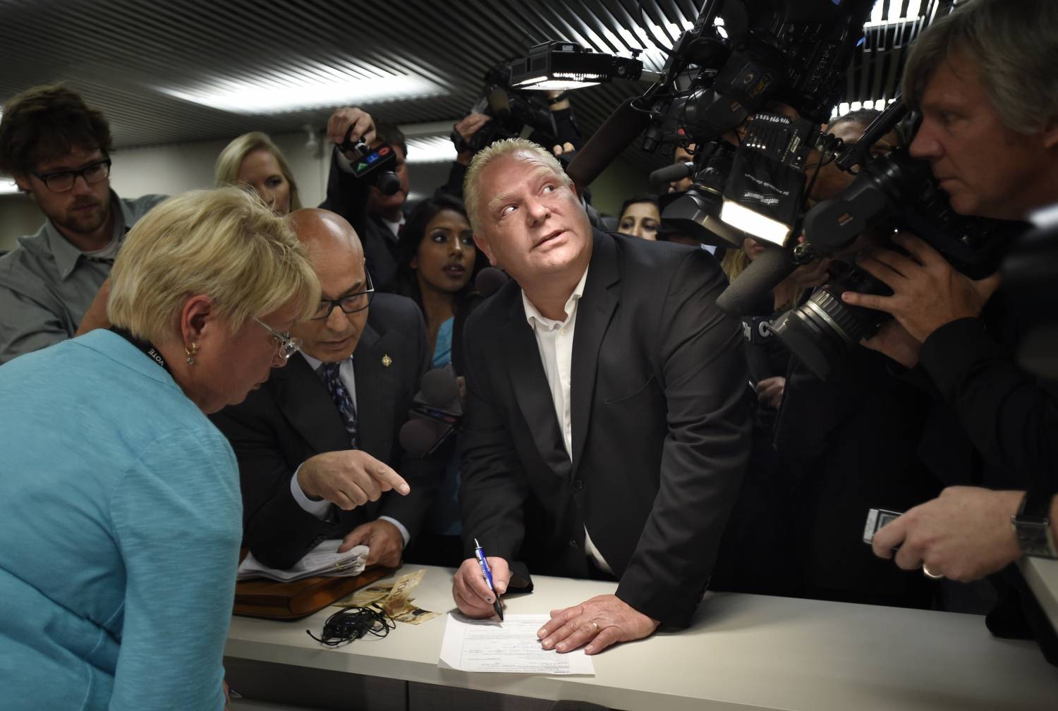Toronto Councillor Doug Ford looks up at cameras while signing his nomination papers at the City Hall's elections office.