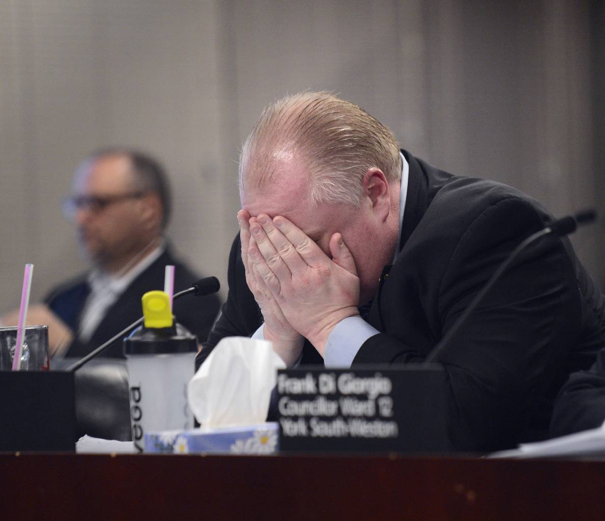 Toronto Mayor Rob Ford reacts to Councillor David Shiner's references to staffing levels during a budget meeting.