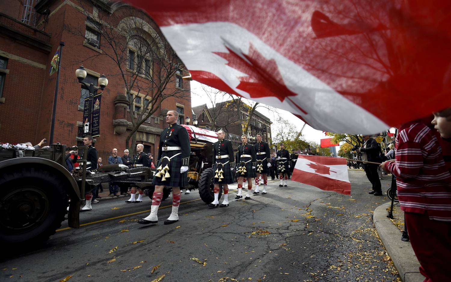 The casket bearing Corporal Nathan Cirillo moves past the John Weir Foote armoury in Hamilton, Ontario.