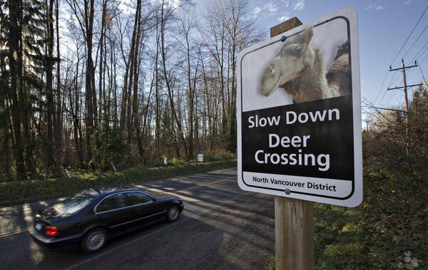 A car passes a sign with a picture of camel warning of an upcoming deer crossing area in North Vancouver, British Columbia November 26, 2013. The signs were put up to attract drivers' attention and to be aware of possible deer on the road.ANDY CLARK/Reuters