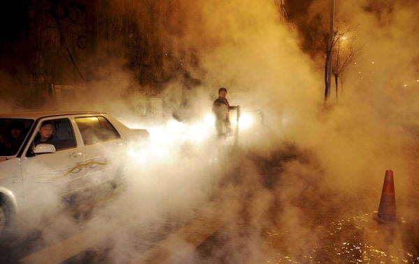 A car drives past as a woman standing amidst thick steam after hot water leaked from a heating pipeline onto a street in Taiyuan, Shanxi province November 25, 2013. Water as hot as 70 degrees Celsius leaked onto the street on Tuesday afternoon, injuring several pedestrians, local media reported.Reuters