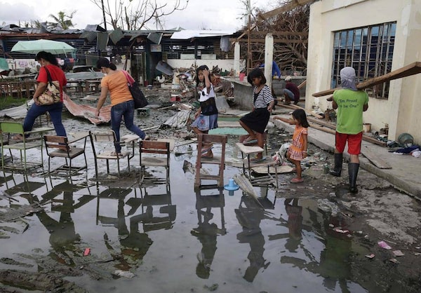 Typhoon survivors cross a row of school chairs to avoid a muddy portion of an evacuation center Tuesday Nov. 26, 2013 after being ravaged by Typhoon Haiyan more than two weeks ago at Tacloban city, Leyte province in central Philippines.Bullit Marquez/The Associated Press