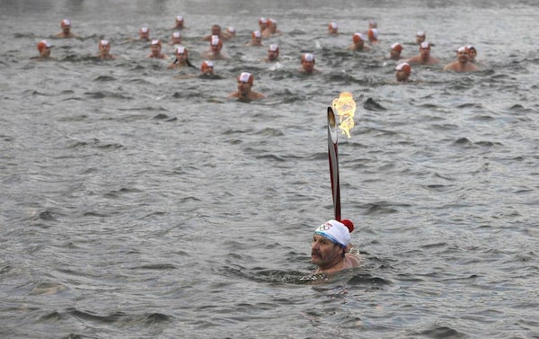 Nikolay Petshak carries the Olympic torch as he leads a group of members of local winter swimming clubs during the Sochi 2014 Winter Olympic torch relay in the waters of the Yenisei River in Russia's Siberian city of Krasnoyarsk, November 26, 2013. Thirty members of winter swimming clubs took part in the relay, with the water temperature at about 5 degrees Celsius.ILYA NAYMUSHIN/Reuters