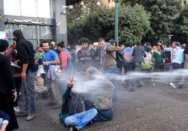 Egyptian police fire water cannons to disperse a protest by secular anti-government activists in Cairo, Tuesday, Nov. 26, 2013, the security forces' first implementation of a controversial new law forbidding protests held without a permit from authorities.Mohammed Asad/The Associated Press