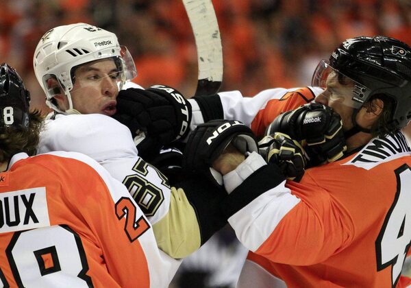 Philadelphia Flyers Claude Giroux, left, holds on to Pittsburgh Penguins Sidney Crosby as Kimmo Timonen, right, lands a punch to Crosby's jaw during the first period of Game 3 in a first-round NHL Stanley Cup playoffs hockey series, Sunday, April 15, 2012, in Philadelphia.TOM MIHALEK