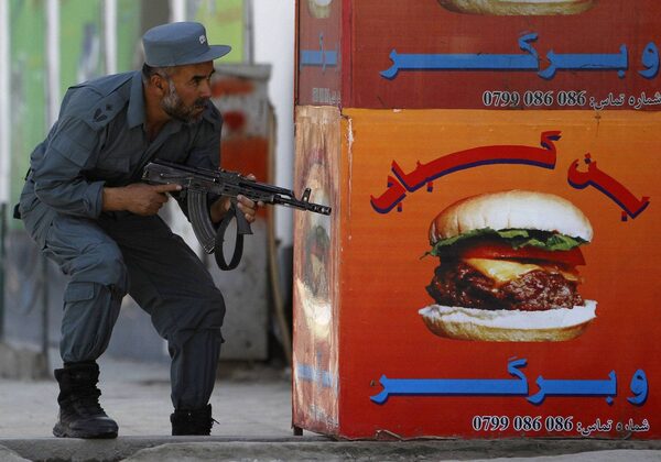 An Afghan policeman takes position at the site of an attack in Kabul April 15, 2012.OMAR SOBHANI
