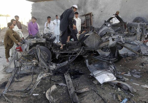 Afghan men stand around the wreckage of a car used by a suicide attacker in Jalalabad province April 15, 2012.PARWIZ