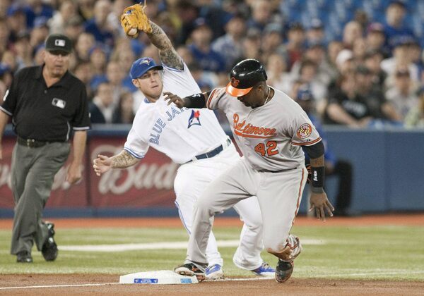 Baltimore Orioles Wilson Betemit (right) steals third base in front of Toronto Blue Jays Brett Lawrie during the second inning of MLB baseball action in Toronto on Sunday, April 15 , 2012.Chris Young