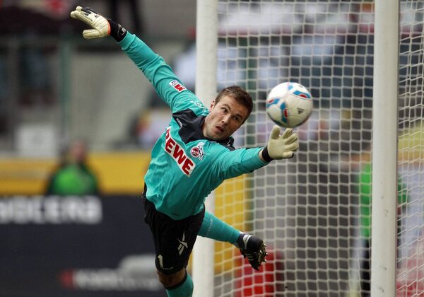 Cologne's goalkeeper Michael Rensing fails to save a goal from Borussia Moenchengladbach's Marco Reus (not pictured) during the German first division Bundesliga soccer match in Moenchengladbach April 15, 2012.INA FASSBENDER