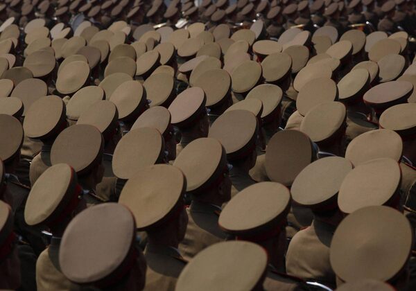 Hats of a crowd of North Korean military members seated in a stadium in Pyongyang are seen during a mass meeting called by the Central Committee of North Korea's ruling party on Saturday April 14, 2012.Vincent Yu