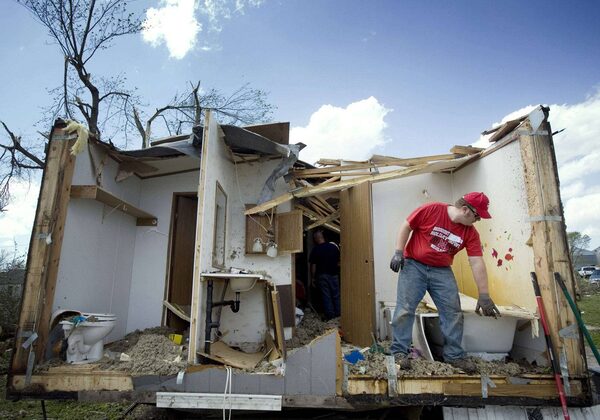Tim Crom picks up debris from a damaged home in Thurman, Iowa April 15, 2012 after dozens of tornados tore through the region.LANE HICKENBOTTOM