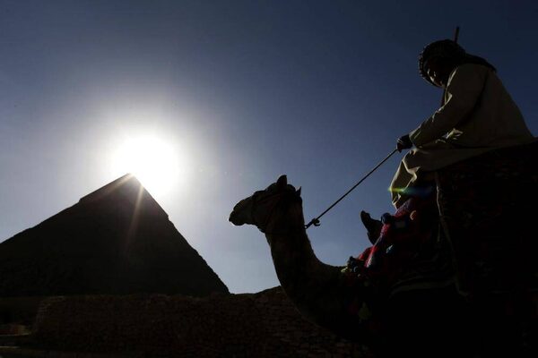 A man rides a camel past a pyramid in Giza, Egypt. An Egyptian opposition alliance urged supporters on Wednesday to vote "No" in the referendum on a disputed constitution but said it may still boycott if its conditions are not met.Hassan Ammar/The Associated Press