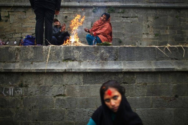 Nepalese devotees warm themselves on a fire during the Bala Chaturdasi festival at the Pashupatinath Temple in Katmandu, Nepal. Bala Chaturdashi is celebrated in memory of departed family members by lighting oil lamps and scattering seven types of grains along a prescribed route.Niranjan Shrestha/The Associated Press