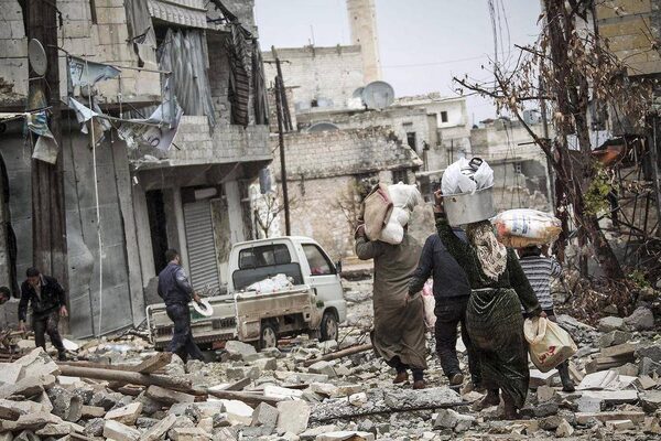 Syrian residents carry their belongings after their homes were damaged due to fighting between Free Syrian Army fighters and government forces in Aleppo, Syria.Narciso Contreras/The Associated Press