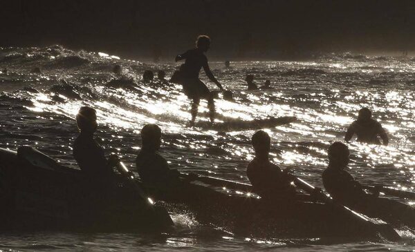 A surfer enjoys a wave as a surf boat makes its way to the sea at Bondi Beach in Sydney. Australia's iconic Bondi beach receives up to 40,000 visitors on a busy summer day according to local authorities.DANIEL MUNOZ/Reuters