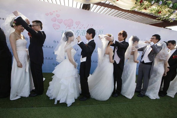 Twelve couples attend a mass wedding ceremony at the Peak in Hong Kong. At least 700 couples are expected to get married in the date 12/12/12, the last such triple-date in this year in Hong Kong as they believe the date will bring them everlasting love.Kin Cheung/The Associated Press