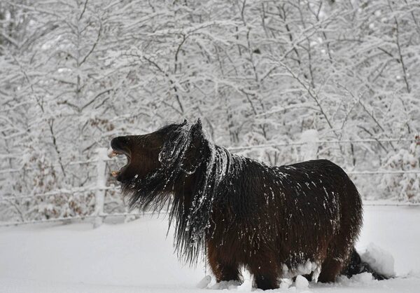 A horse stands knee-deep in the snow near Baraibar, northern Spain.
