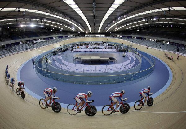 Cyclists ride during a training session at the velodrome for the London 2012 Olympic Games in London.