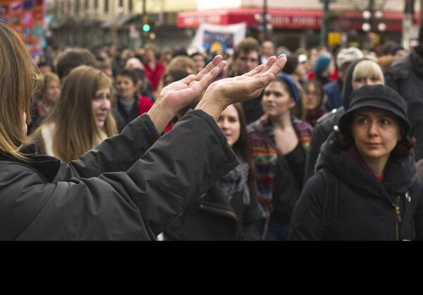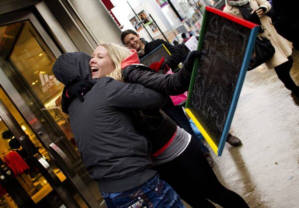 Stephanie Mulhall, 23, right, and Fernando Brava, 22, behind, offer free hugs and valentines to passers-by on the corner of Yonge and Dundas Streets in Toronto.