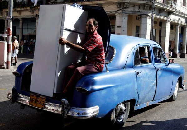 A man transports a new Chinese-made refrigerator in the trunk of an old car in Havana, Cuba.
