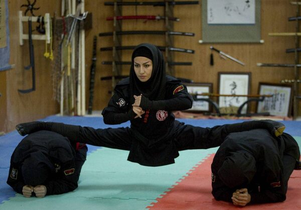 A Ninjutsu practitioner performs a split as members of various Ninjutsu schools showcase their skills to the media in a gym at Karaj, Iran.