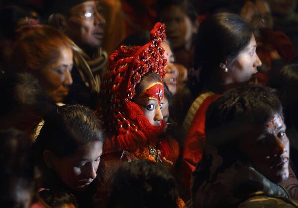 Devotees gather around a Living Goddess Kumari (C) as she observes the bathing rituals of Lord Seto Machindranath in Kathmandu January 1, 2012. The Kumari, a young pre-pubescent girl who is a manifestation of a Goddess, is worshipped by both Hindus and Buddhists in Nepal. The Kumari emerges from her temple about 12 times a year for religious occasions. Nepalese people pray to Seto Machindranath for rainfall and good harvest.