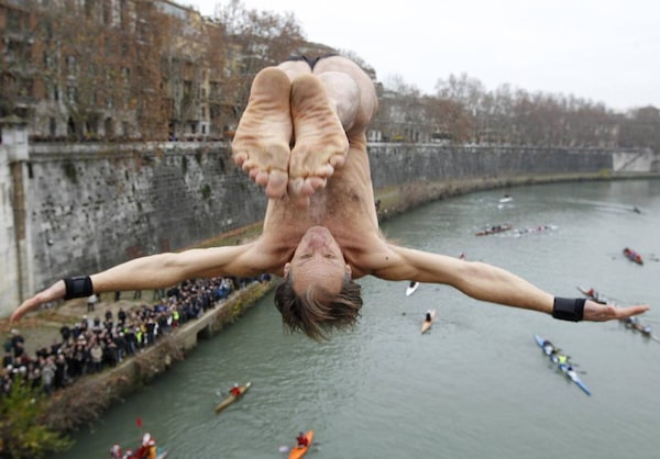 Marco Fois of Italy dives into the Tiber River from the Cavour bridge, as part of traditional New Year celebrations in Rome January 1, 2012. Five men jumped into the muddy waters of the Tiber, continuing an annual tradition which dates back to 1946.