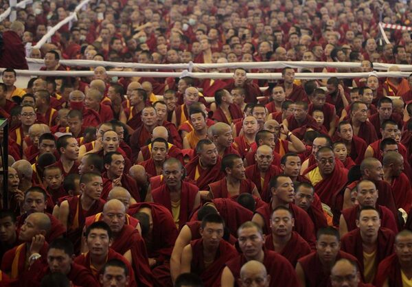 Buddhist monks listen to the teachings of Tibetan spiritual leader the Dalai Lama on the first day of Buddhist festival Kalachakra, in the town of Bodh Gaya, believed to be the place where Buddha attained enlightenment, in the state of Bihar, India, Sunday, Jan. 1, 2012.
