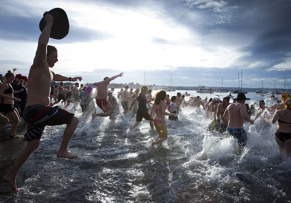 Participants in the Vancouver polar bear swim run into the ocean January 1, 2012.
