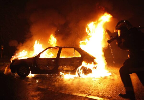 A firefighter extinguishes a burning car early this morning during the New Year's eve celebration in Lille January 1, 2012.