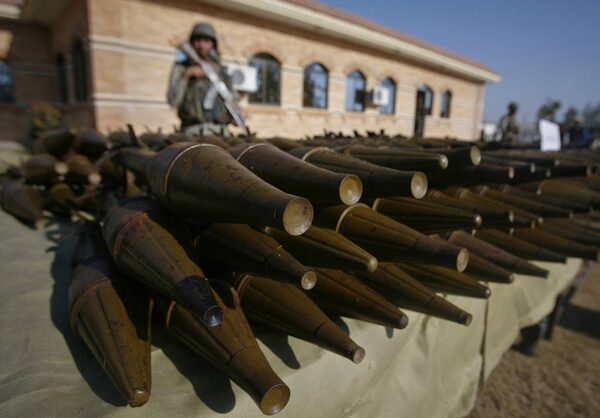 A soldier stands guard near seized ammunition, showcased to the media at a military compound in Bara, a town located in Pakistan's Khyber Agency January 1, 2012. Pakistan's military on Sunday said in a statement the weapons -- including mortars, rockets, granades and anti-aircraft guns -- were seized from militants during a recent search operation.