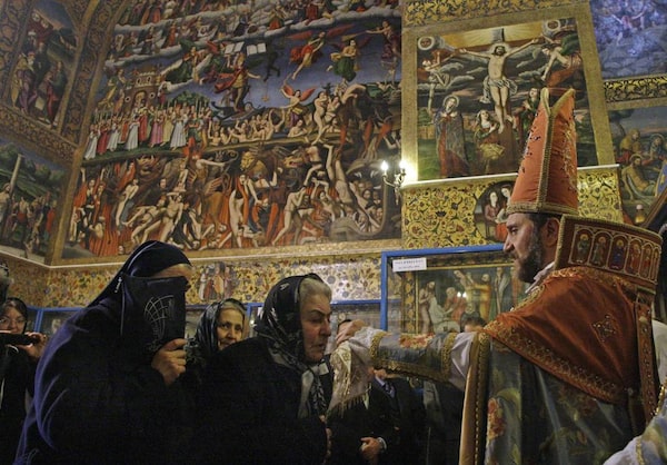 An Iranian Christian kisses the Cross held by archbishop Babken Charian, during New Year Mass at the Vank church in the central city of Isfahan, 390 km south of the capital Tehran, Iran, Sunday, Jan. 1, 2012.