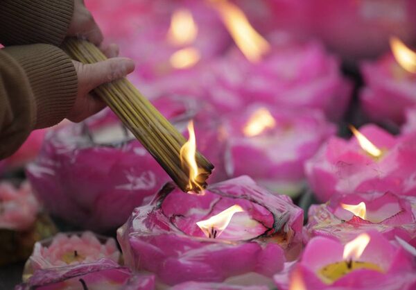 A worshipper burns joss sticks from the burning lotus flower-shape candles to pay his first visit of the year at Jade Temple on Sunday, Jan. 1, 2012 in Shanghai, China.