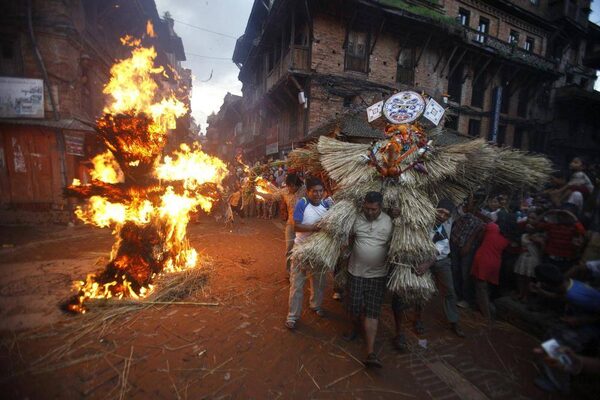 People carry an effigy of demon Ghantakarna as another effigy of the demon is burnt to symbolize the destruction of evil, during the Ghantakarna festival in the ancient city of Bhaktapur July 17, 2012. According to legend, the demon is believed to "steal" children and women from their homes and localities.NAVESH CHITRAKAR/Reuters