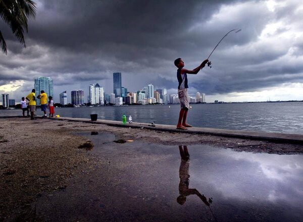 Denys Alvarez, 13, of Little Havana, fishes from the seawall under the Rickenbacker Causeway as afternoon storms head in over the skyline of Brickell on Tuesday July 17, 2012.Patrick Farrell/The Associated Press
