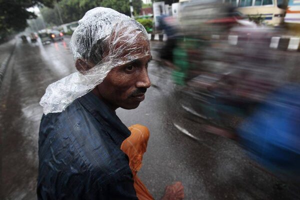 An Indian family on a motorcycle protect themselves with an umbrella from a heavy monsoon shower in Hyderabad, India, Tuesday, July 17, 2012. The monsoon rains which usually hit India from June to September are crucial for farmers whose crops feed hundreds of millions of people.Mahesh Kumar A/The Associated Press