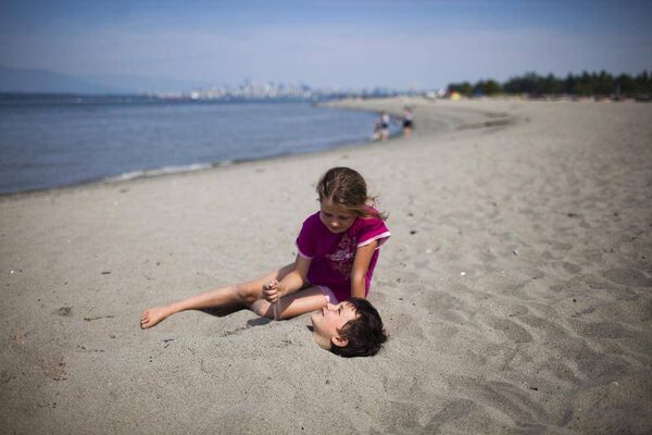 Emily Siemens, age 10, buries her brother, Nicholas, age 6, in the sand while playing in the sun at Spanish Banks Beach in Vancouver, British Columbia, Tuesday, July 17, 2012.Rafal Gerszak/The Globe and Mail