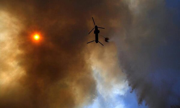 A helicopter drops water on the north flank of the Fontenelle Fire outside Big Piney, Wyoming. Over 800 firefighters are working 15 hour shifts battling the fire that has exceeded 56,000 acres, according to fire information services. Record fire danger and long stretches of the red flag warning days have made it challenging to control. The crews are working and sleeping in close proximity to the fire in an effort to contain it. The blaze, burning in dead and thick stands of timber, started on June 24 and is currently 15 percent contained. Recently firefighting crews from as far away as Alaska have arrived to fight it.JIM URQUHART/Reuters