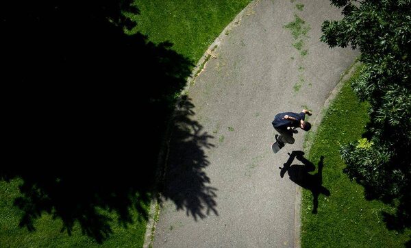 A skateboarder does a trick while riding on a path along False Creek in Vancouver, B.C.. After gloomy, rainy weather for much of June sunshine and warmer temperatures are forecast for the coming week.DARRYL DYCK