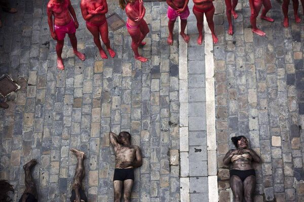 Animal rights protesters lie covered in fake blood and black paint as they prepare to form the words "Stop bullfighting" during a demonstration calling for the abolition of bull runs and bullfights, a day before the start of the famous running of the bulls San Fermin festival, in Pamplona. The annual week-long fiesta gets underway July 6, with the first bull run in the morning of July 7.SUSANA VERA/Reuters