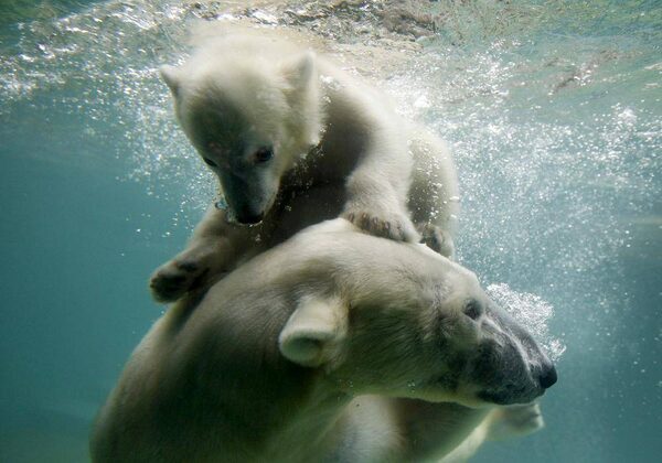 Polar bear cub Anori swims with her mother Vilma in their enclosure at the zoo in Wuppertal June 6, 2012. Anori was born on January 4, 2012.INA FASSBENDER/Reuters