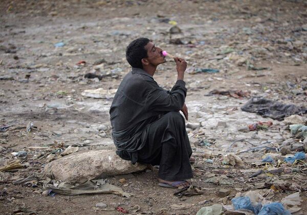 A man eats a popsicle while sitting through a field littered with waste in a slum area of Karachi June 6, 2012.AKHTAR SOOMRO/Reuters